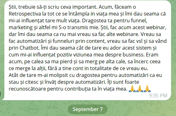 Organizăm împreună un webinar, provocare sau masterclass, cu sistem complet de înscriere și vânzare. Apoi analizăm împreună rezultatele și optimizăm pentru viitor. La final, ai lansat, ai clienți și ai un sistem care poate fi repetat.